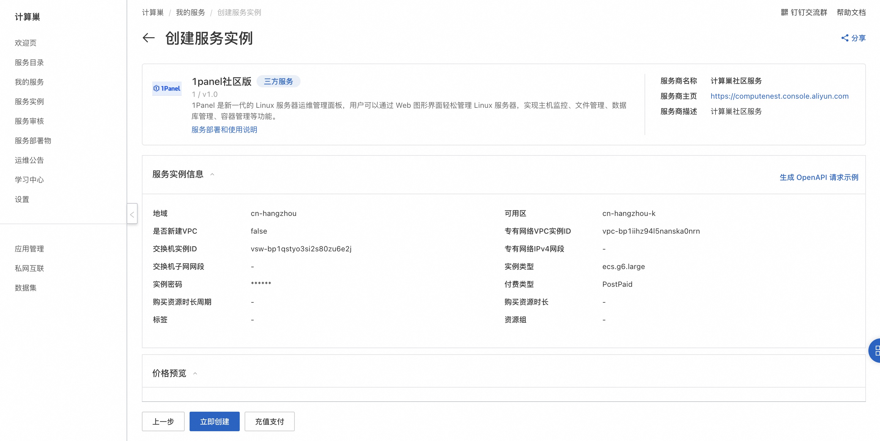 计算巢部署指南⚓︎ 阿里云计算巢提供了软件与资源的一体化交付的完善基础能力,助力服务商、开发者的提升服务能力和降低运营成本。计算巢已经支持快速部署 1Panel 社区版。 部署流程⚓︎ 单击部署链接,进入服务实例部署界面。 选择新建ECS实例并根据界面提示配置参数,配置完成后点击下一步:确认订单。 点击立即创建,等待服务实例创建完成。 服务实例创建成功后,进入服务实例详情页。在概览页可获取1Panel面板登录信息,点击外网面板地址,登录1Panel面板。