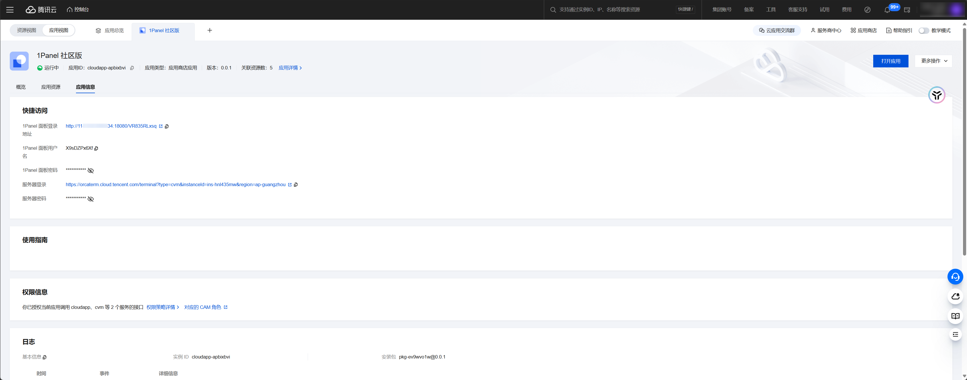 点击应用详情页面上方的 应用信息,即可查看到 1Panel 面板的登录地址,随机生成的用户名密码等信息。