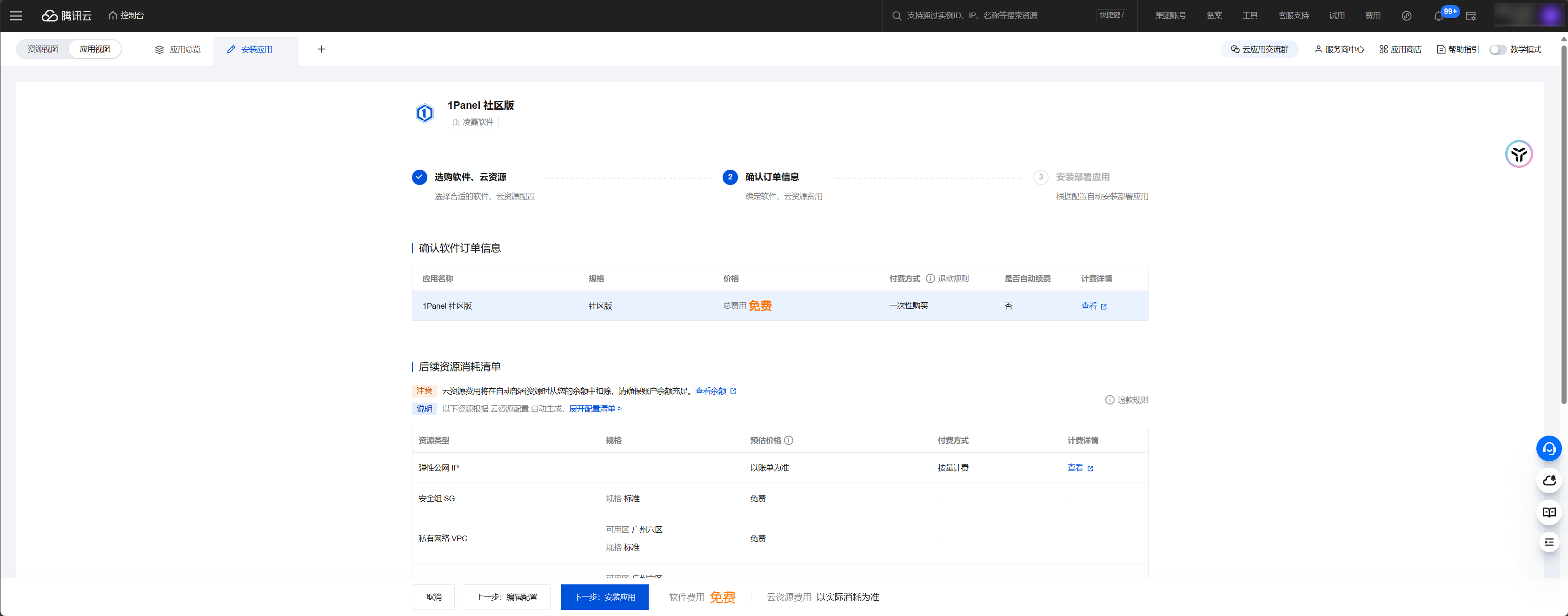 信息确认无误后,点击 下一步:安装应用,腾讯云将自动完成云服务器、安全组、公网 IP 等相关资源的创建及 1Panel 的安装配置。等待 1Panel 云应用部署完成后,页面将自动跳转到新部署的 1Panel 云应用详情页面。