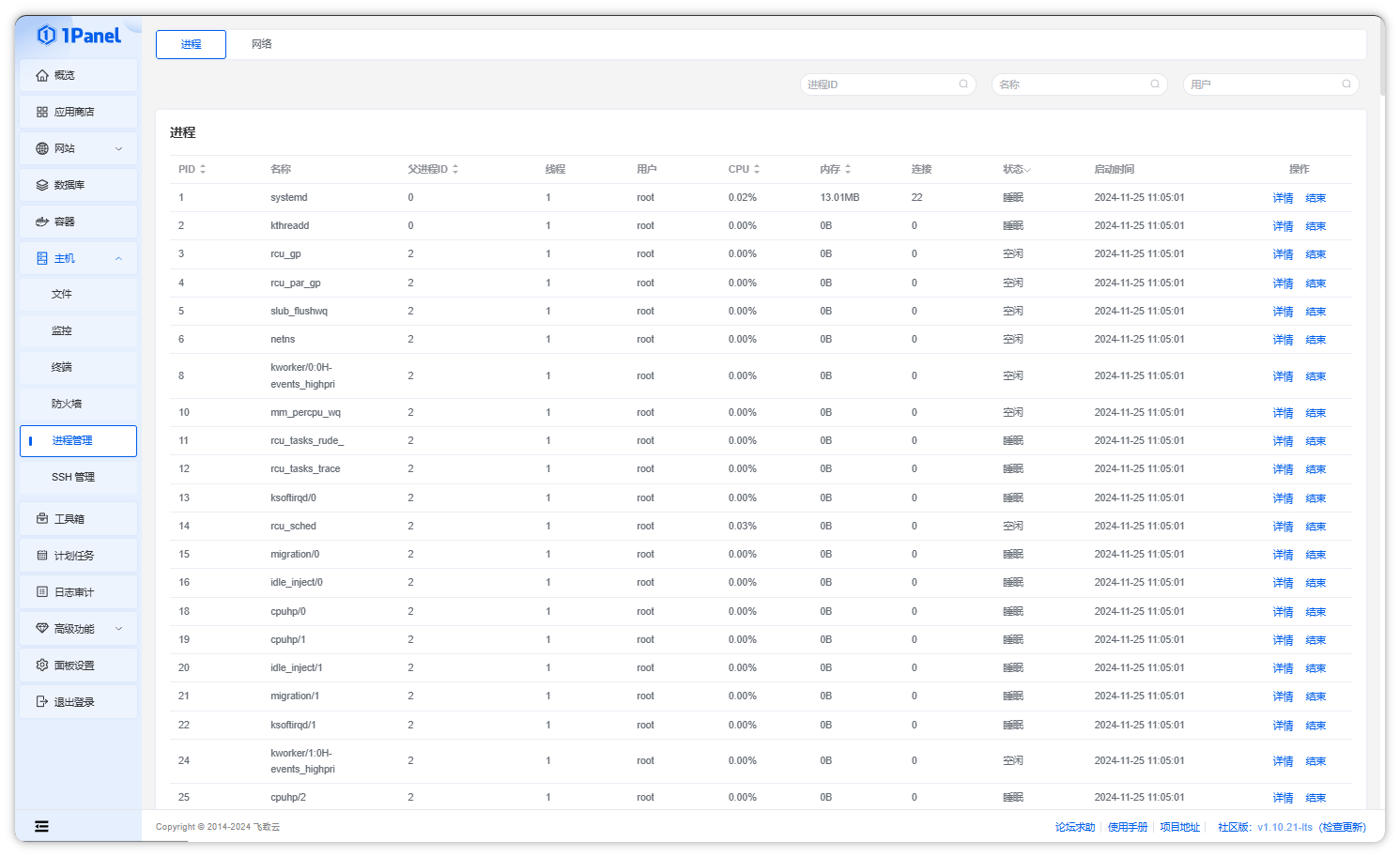 点击【主机 - 进程管理】菜单,进入进程管理页面。