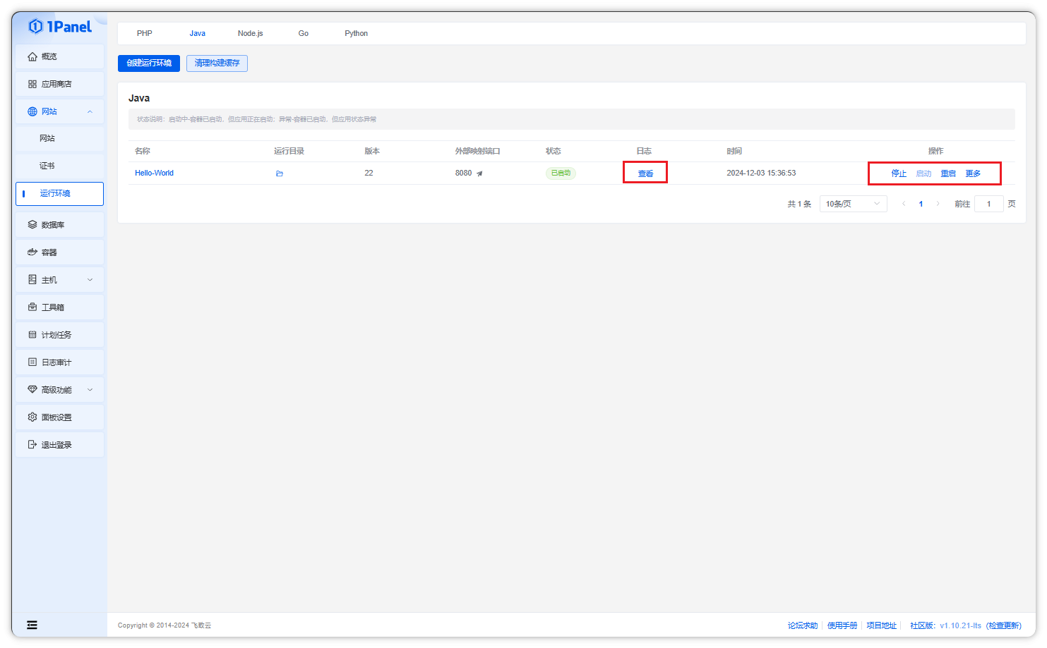Java 创建 Java 运行环境⚓︎ 点击创建运行环境按钮,选择 Java 版本和运行目录等信息 目前支持 Java 1.8、11、17、18、21、22 大版本,用户可以根据自己的需求选择合适的版本。 操作 Java 运行环境⚓︎ 在列表页面,可以对 Java 运行环境进行停止、启动、重启、编辑、删除和查看日志等操作